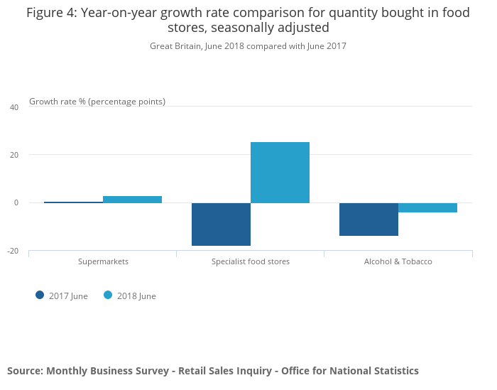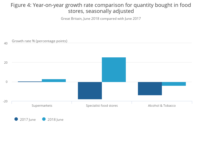 Supermarkets continued to grow on the year at 3.0%, while specialist food stores (including butchers and bakers) increased by 25.3% following a decline of negative 17.8% in June 2017.