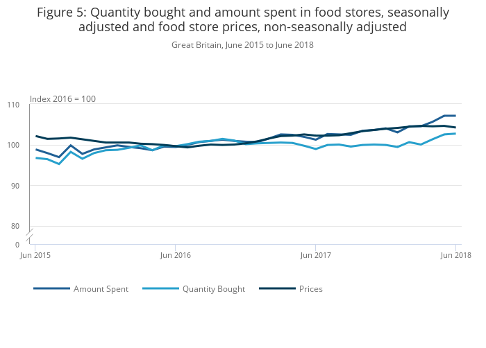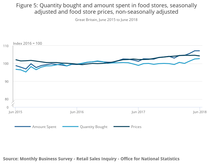 The strong increase of 2.2% in the quantity of food bought in the three months to June 2018 resulted in the highest growth witnessed for the underlying trend since May 2001, which was at 4.2%.