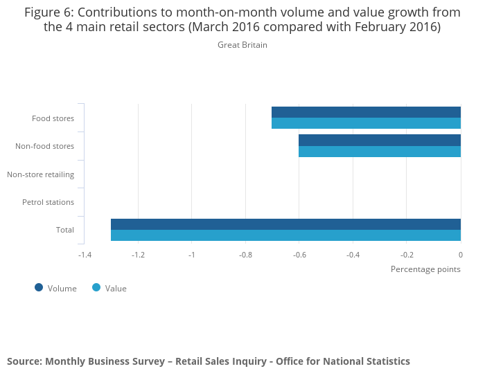 Download this chart Figure 6: Contributions to month-on-month volume and value growth from the 4 main retail sectors (March 2016 compared with February 2016)