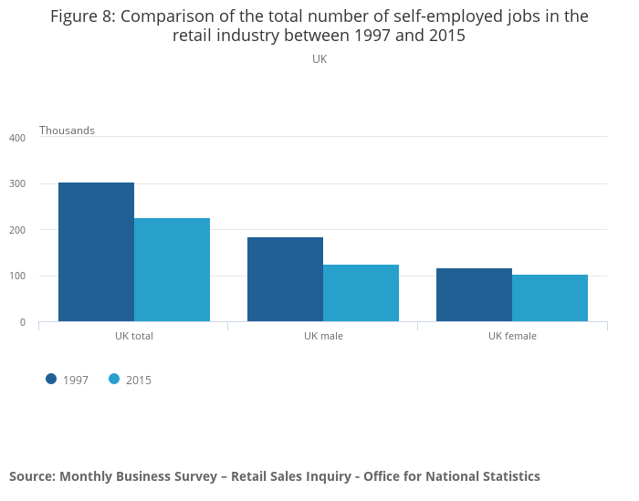 Download this chart Figure 8: Comparison of the total number of self-employed jobs in the retail industry between 1997 and 2015