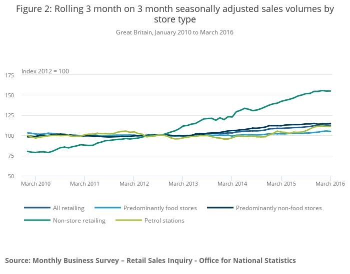 Download this chart Figure 2: Rolling 3 month on 3 month seasonally adjusted sales volumes by store type