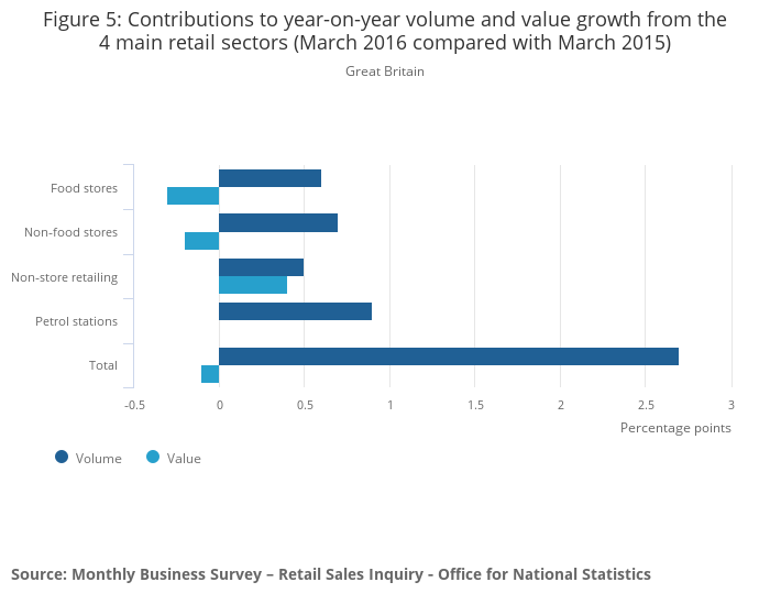 Download this chart Figure 5: Contributions to year-on-year volume and value growth from the 4 main retail sectors (March 2016 compared with March 2015)