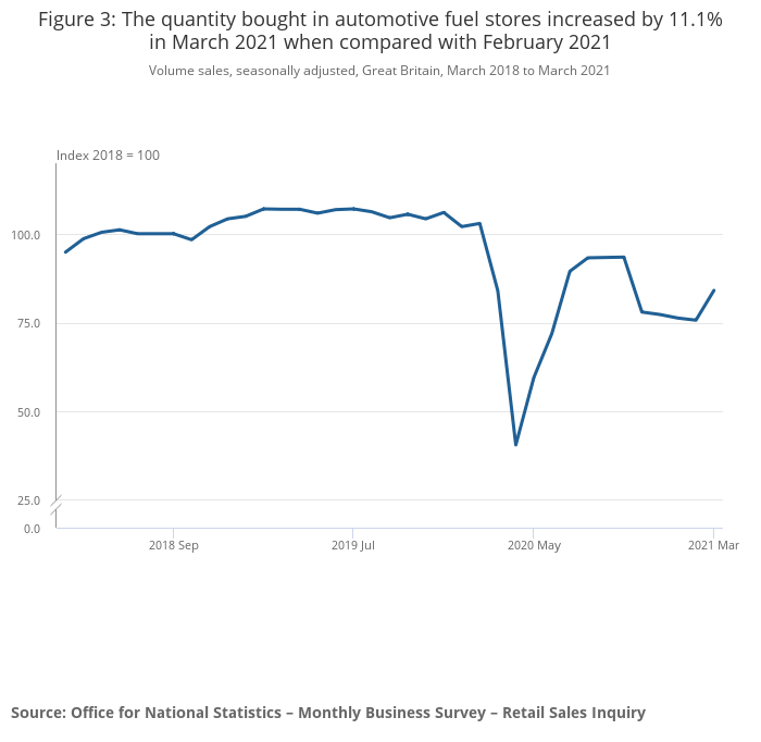 Figure 3: The quantity bought in automotive fuel stores increased by 11.1% in March 2021 when compared with February 2021