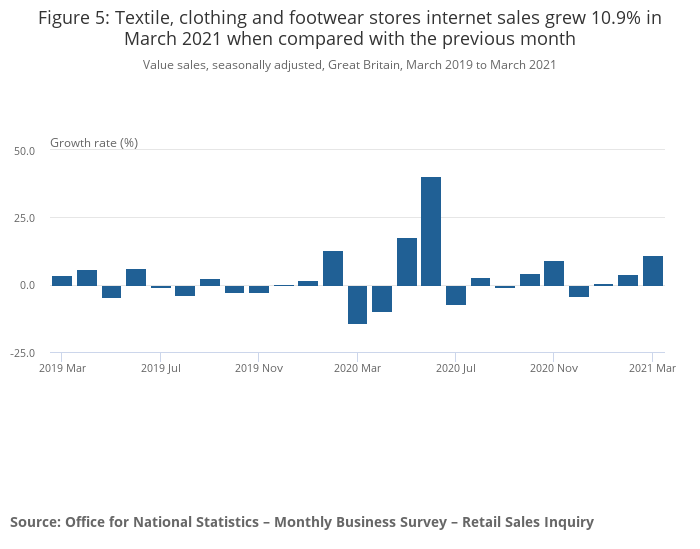Figure 5: Textile, clothing and footwear stores internet sales grew 10.9% in March 2021 when compared with the previous month