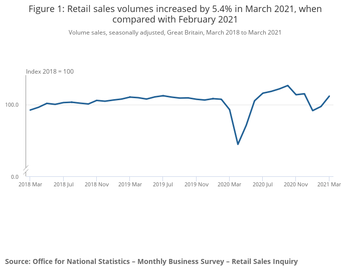Retail sales volumes continued to recover in March 2021, with an increase of 5.4% when compared with the previous month reflecting the effect of the easing of coronavirus (COVID-19) restrictions on consumer spending; sales were 1.6% higher than February 2020 before the impact of the coronavirus pandemic.