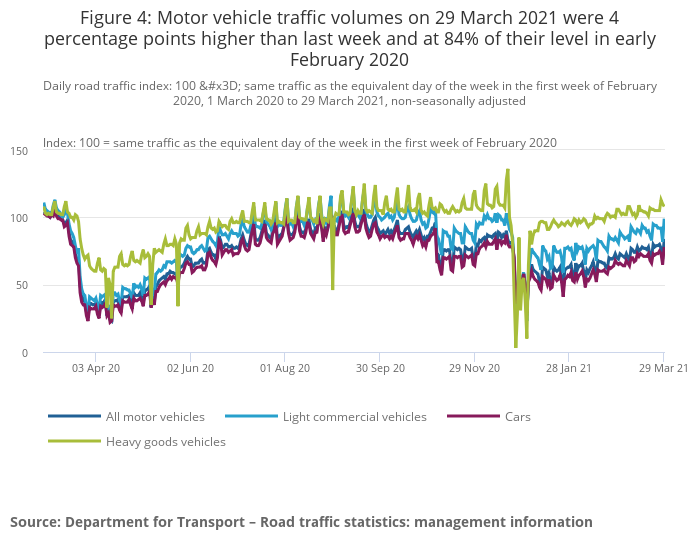 According to Department for Transport (DfT) non-seasonally adjusted road traffic data, the volume of all motor vehicle traffic on Monday 29 March 2021 saw a weekly increase of 4 percentage points to 84% of the level seen on the Monday of the first week in February 2020.