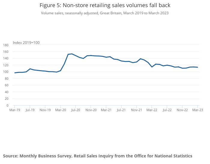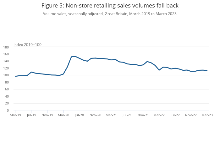 Non-store retailing (predominantly online retailers) sales volumes fell by 0.8% in March 2023, following a rise of 0.3% in February 2023.
