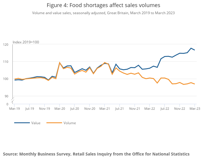 Volume and value sales, seasonally adjusted, Great Britain, March 2019 to March 2023