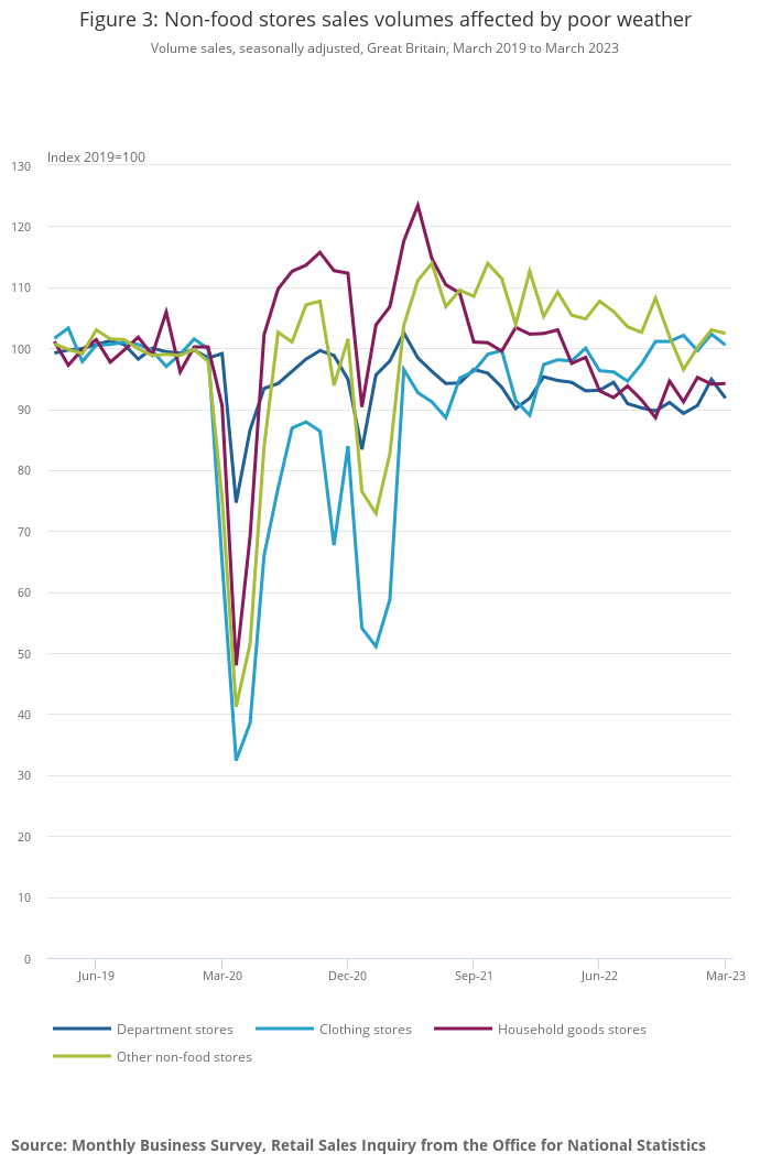 Non-food stores sales volumes fell by 1.3% in March 2023, following a rise of 2.4% in February, with feedback from retailers that poor weather conditions throughout most of March affected sales.