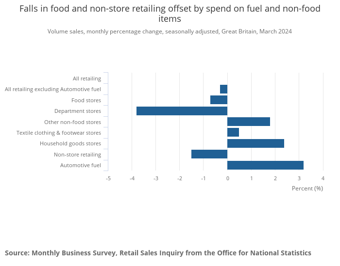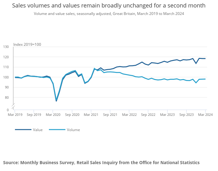 Retail sales volumes (quantity bought) were estimated to be flat (0.0%) in March 2024, following an increase of 0.1% in February 2024 (revised from 0.0%).