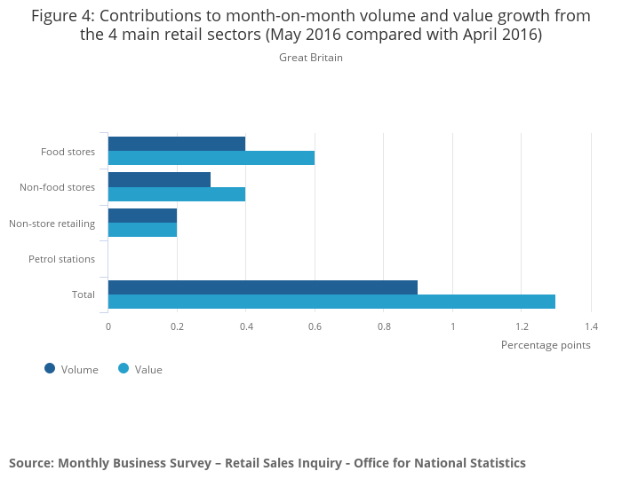 Download this chart Figure 3: Contributions to year-on-year volume and value growth from the 4 main retail sectors (May 2016 compared with May 2015)
