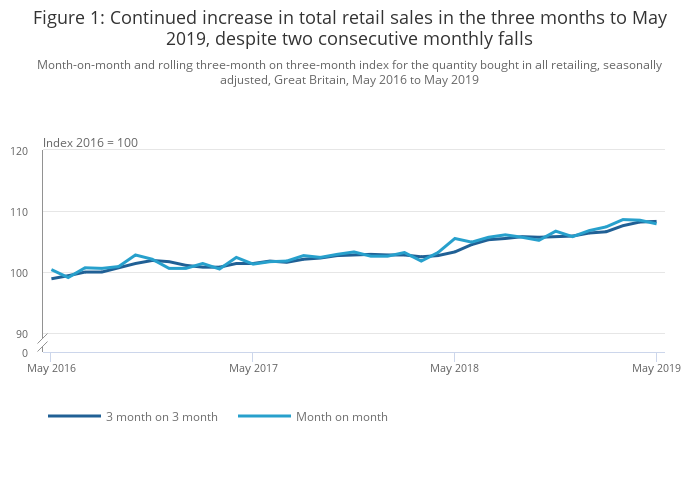 Download this chart Figure 1: Continued increase in total retail sales in the three months to May 2019, despite two consecutive monthly falls