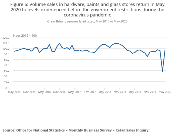Figure 6: Volume sales in hardware, paints and glass stores return in May 2020 to levels experienced before the government restrictions during the coronavirus pandemic