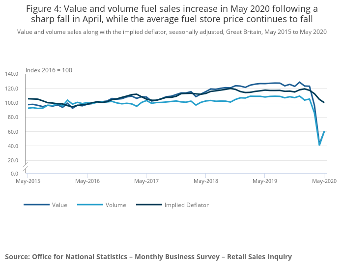 With falling fuel prices, the value of fuel sales increased by 42.4% and volume sales at a slightly faster rate at 49.1%, but still remain at low levels following the sharp fall in sales in March and April 2020.