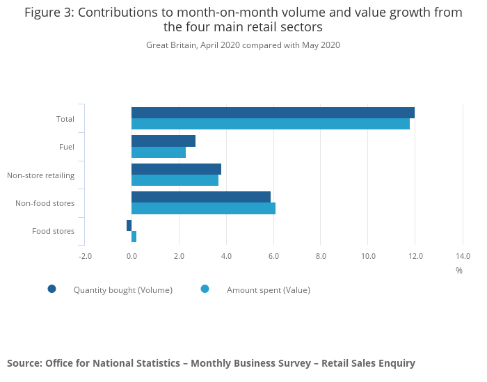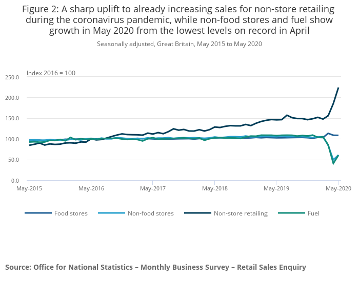 Figure 2: A sharp uplift to already increasing sales for non-store retailing during the coronavirus pandemic, while non-food stores and fuel show growth in May 2020 from the lowest levels on record in April