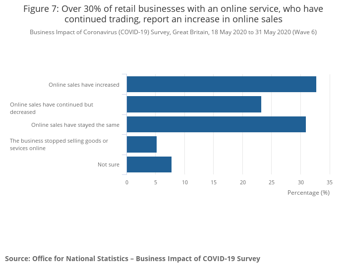Figure 7: Over 30% of retail businesses with an online service, who have continued trading, report an increase in online sales