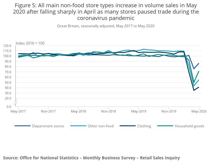 Image .csv .xlsIn May 2020, all non-food store sales increased from the low levels experienced in April 2020 with the temporary closure of many non-essential stores during the pandemic. Feedback from retailers informed us that some stores were able to trade again following the ease of the “lockdown” on 13 May in England, while some moved to online.