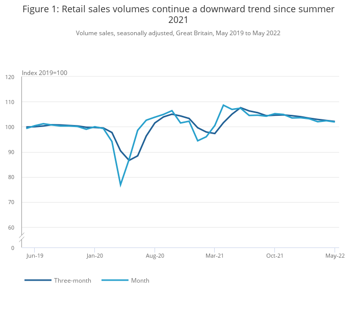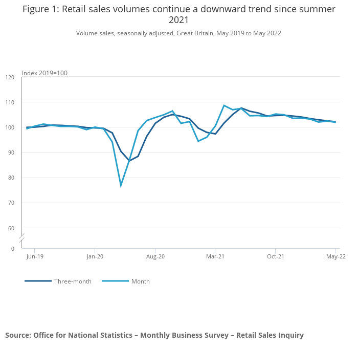 In the three months to May 2022, sales volumes fell by 1.3% when compared with the previous three months; this continues the downward trend since summer 2021.