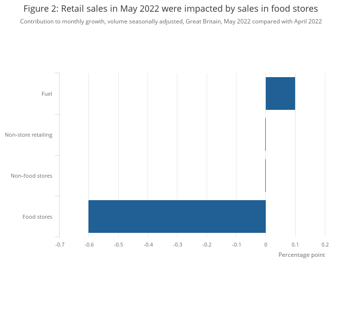 Image .csv .xlsFigure 2 shows the contributions to the 0.5% month-on-month fall in overall retail sales volumes (quantity bought) in May 2022. This highlights that the fall over the month was because of food stores.