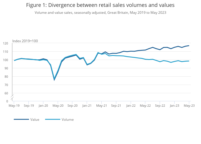 Volume and value sales, seasonally adjusted, Great Britain, May 2019 to May 2023