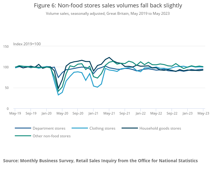 Non-food stores sales volumes fell by 0.2% in May 2023, following a rise of 0.9% in April.