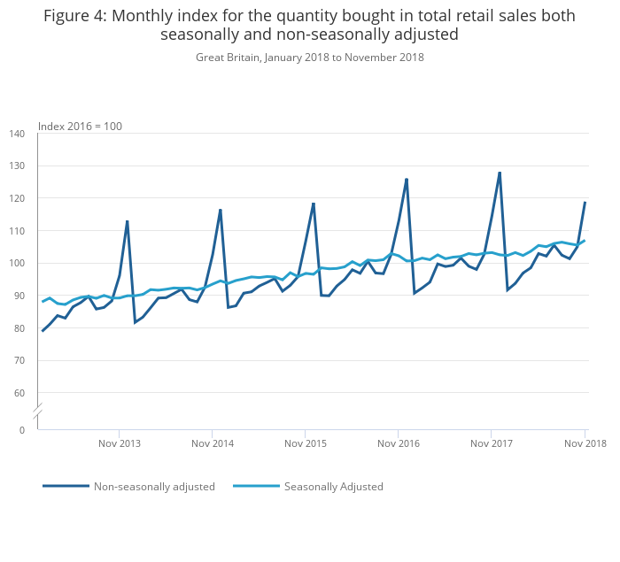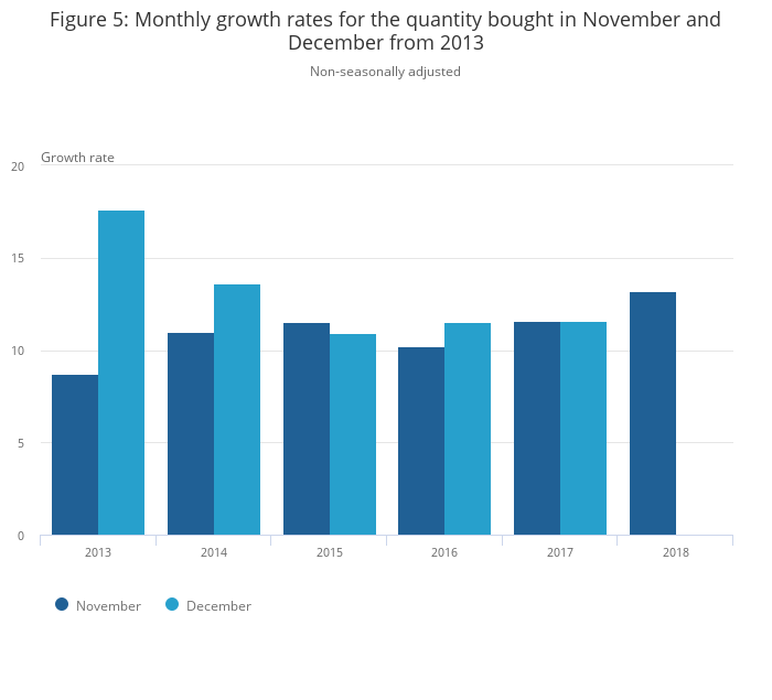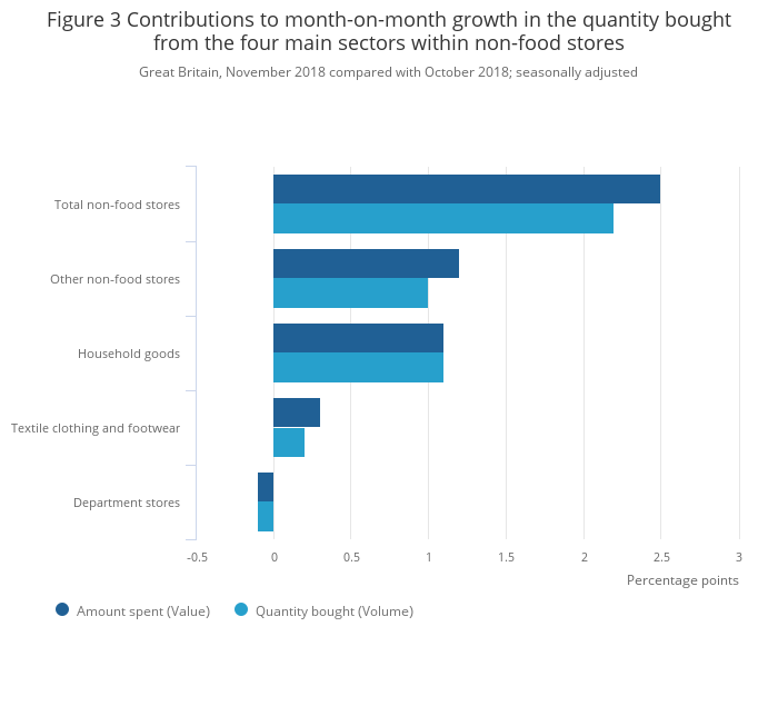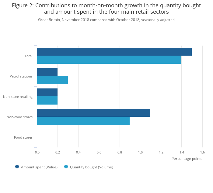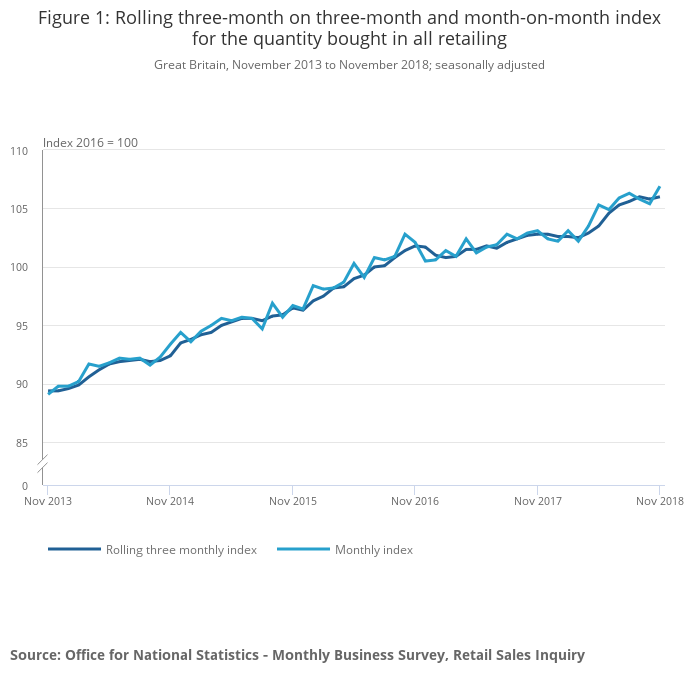 Retailers reported strong growth on the month due to Black Friday promotions in November, which continues the shifting pattern in consumer spending to sales occurring earlier in the year; the non-seasonally adjusted growth rate in November 2018 was 13.2% in comparison with 8.7% in November 2013.