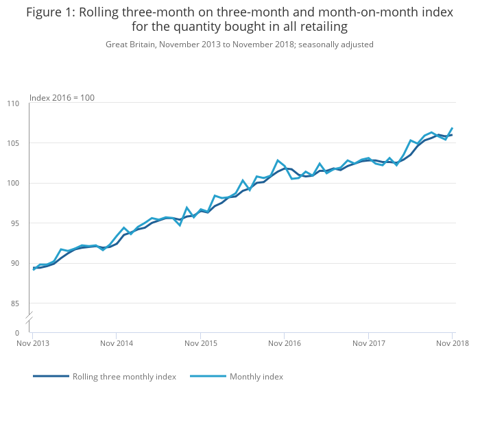 In the three months to November 2018, the quantity bought in retail sales showed an increase of 0.4% when compared with the previous three months due to growths in non-food stores and online retailing.