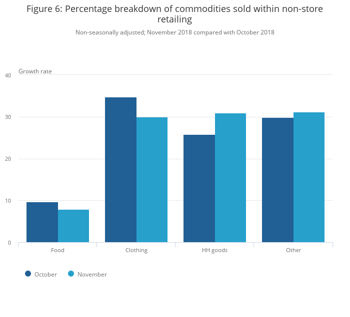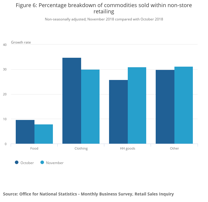 Image .csv .xls“Other goods” accounted for the largest proportion of non-store retailing in November 2018 at 31.2%; an increase on the 29.8% reported in October 2018. Household goods also saw an increase in the proportion bought in non-store retail in November; up to 30.9% compared with the 25.8% reported in October, with anecdotal evidence from retailers suggesting the proportional growth can be attributed to Black Friday promotions.