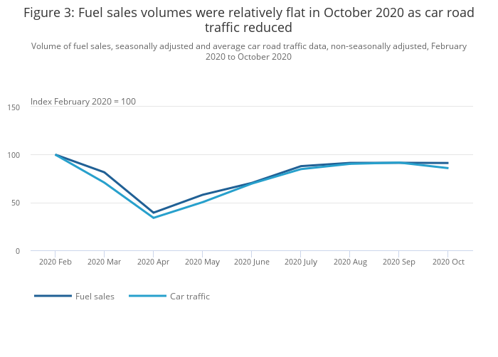 Download this chart Figure 3: Fuel sales volumes were relatively flat in October 2020 as car road traffic reduced