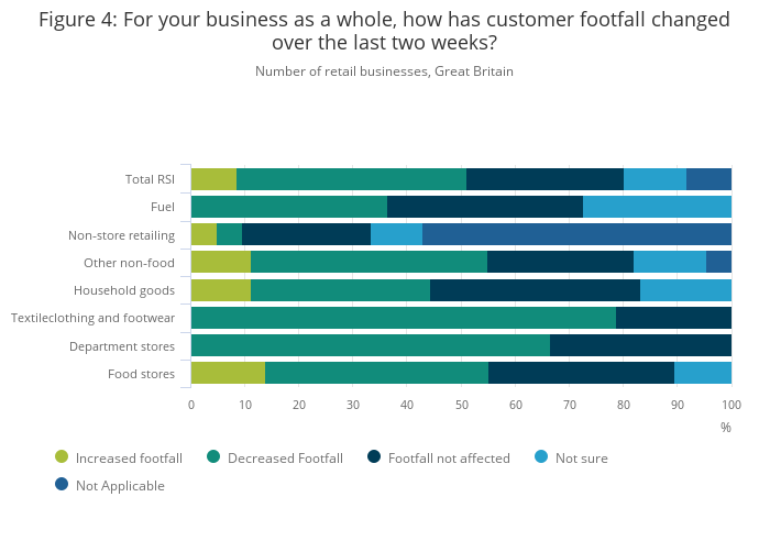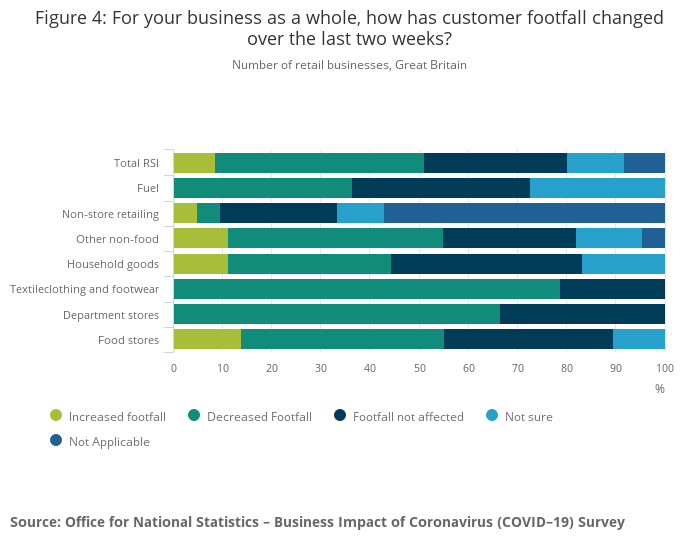 - Businesses were asked “For your business as a whole, how has customer footfall changed over the last two weeks?”