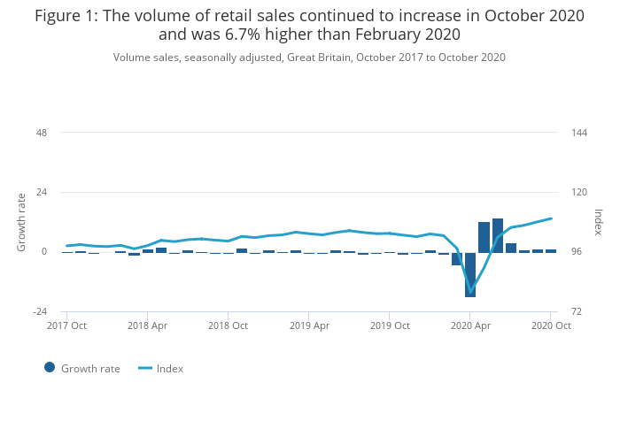 All measures in the total retail sales industry saw an increase in October 2020. The monthly growth rate for value sales was 1.4% and for volume sales 1.2%. This was the sixth consecutive month of growth resulting in value and volume sales 5.2% and 6.7% higher respectively than in February 2020, before coronavirus (COVID-19) lockdown restrictions were applied in the UK.