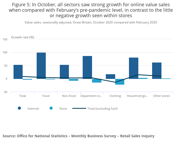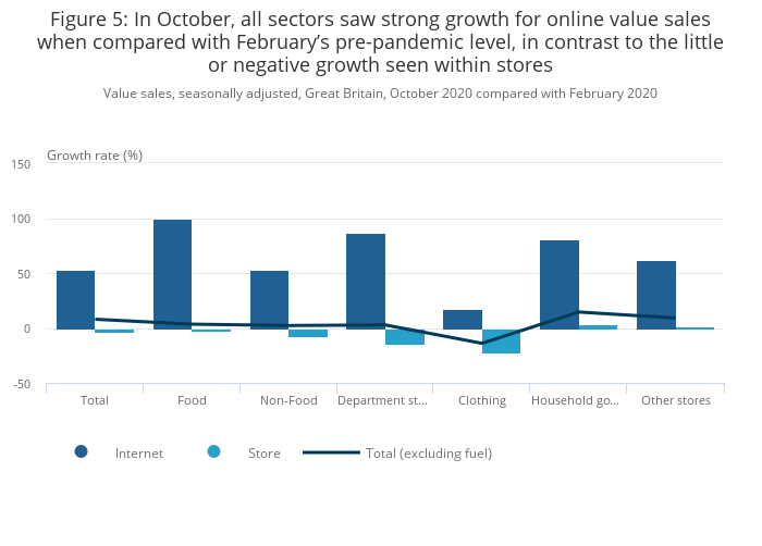In October 2020, total retail sales values (excluding fuel) increased by 7.9% when compared with February 2020, driven by a strong increase for sales online at 52.8% in comparison with a decline in store sales at negative 3.3%.