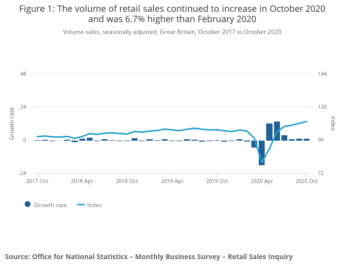 Figure 1: The volume of retail sales continued to increase in October 2020 and was 6.7% higher than February 2020