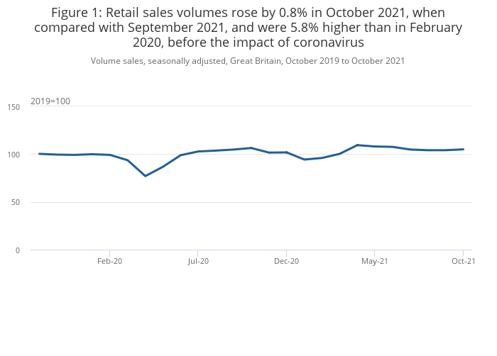 Retail sales volumes rose by 0.8% in October 2021, from a revised unchanged (0.0%) position between August and September (previous estimate was a 0.2% fall); volumes were 5.8% higher than their pre-coronavirus (COVID-19) pandemic February 2020 levels.
