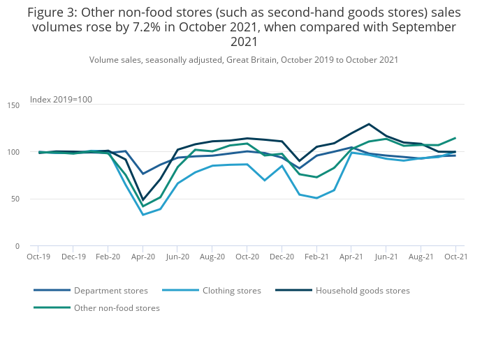 The sub-sector, other non-food stores, reported a monthly rise in sales volumes of 7.2% in October 2021. Within this, second-hand goods stores (charity shops and auction houses) had the largest contribution, followed by sports equipment, games and toy stores.