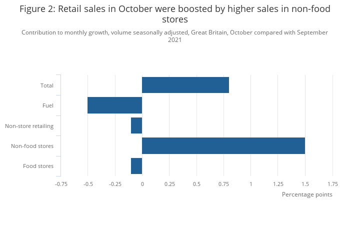 Image .csv .xlsFigure 2 displays the contribution to month-on-month growth in October 2021, with a 0.8% increase over the month in the volume of sales (quantity bought). This highlights that non-food stores was the only main retail sector contributing to growth between September and October.