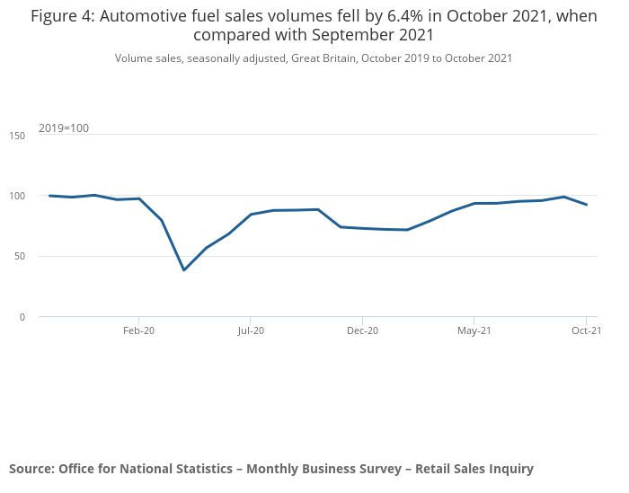 Automotive fuel sales volumes fell by 6.4% in October 2021 as they returned to more typical recent levels following strong growth in September; volumes were 5.0% below their February 2020 levels.