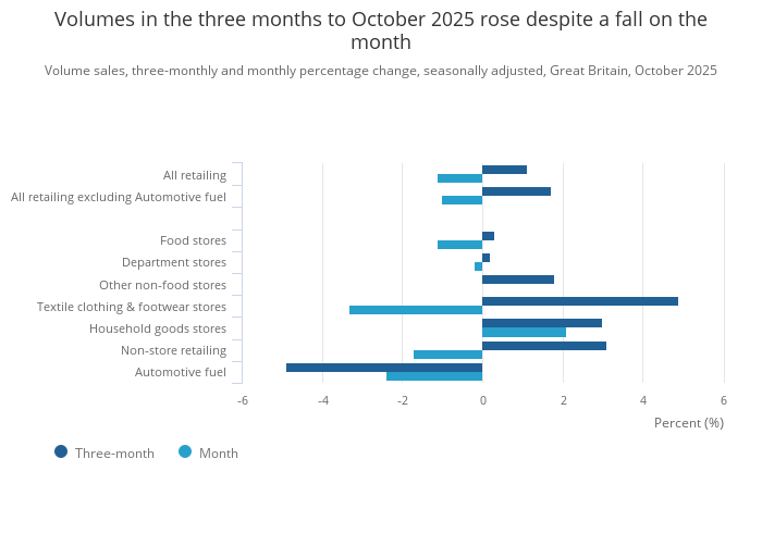 The quantity of goods bought (volume) in retail sales is estimated to have risen by 1.1% in the three months to October 2025 compared with the three months to July 2025. Clothing store sales rounded off a strong performance in those three months, peaking in September, while computer and telecommunication retailers rose across September and October 2025.