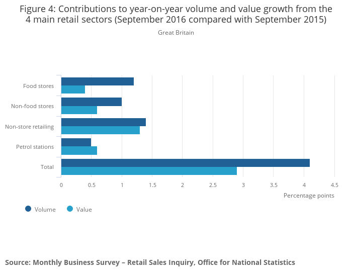 Download this chart Figure 4: Contributions to year-on-year volume and value growth from the 4 main retail sectors (September 2016 compared with September 2015)