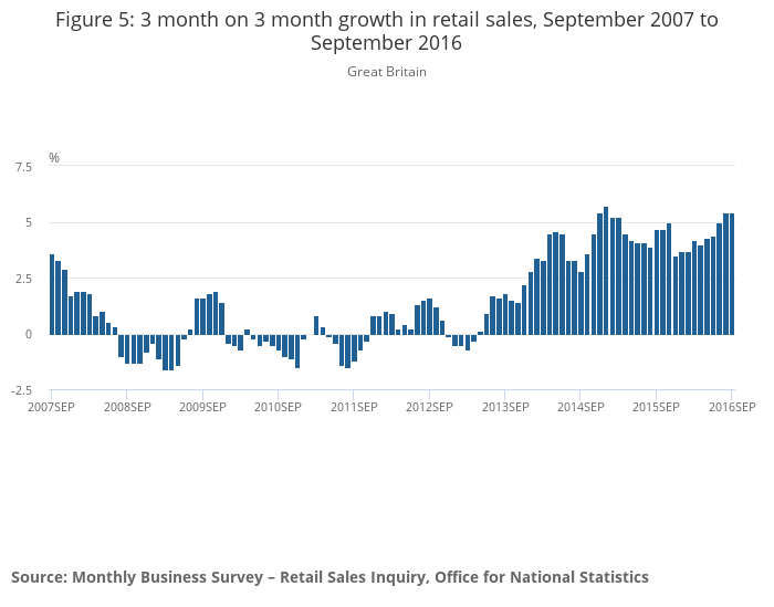 Figure 5: 3 month on 3 month growth in retail sales, September 2007 to September 2016