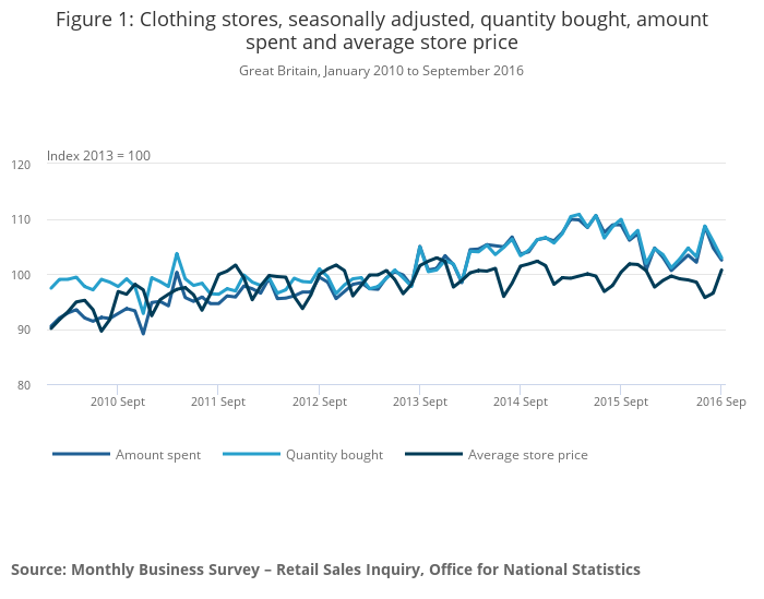 Average store prices (including petrol stations) fell by 1.1% in September 2016 compared with September 2015; there were falls in average store price across all store types, except textile, clothing and footwear stores and petrol stations. This is the smallest decrease since August 2014.