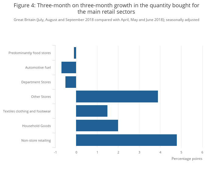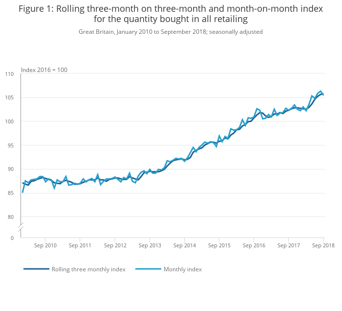 In the three months to September 2018, the quantity bought in retail sales increased by 1.2% when compared with the previous three months, with strong sales in “other stores” and online retailing.