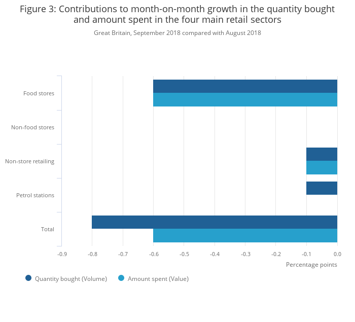 Food stores were the largest contributor towards the overall fall, with the amount spent and quantity bought both having a negative percentage point change of 0.6.
