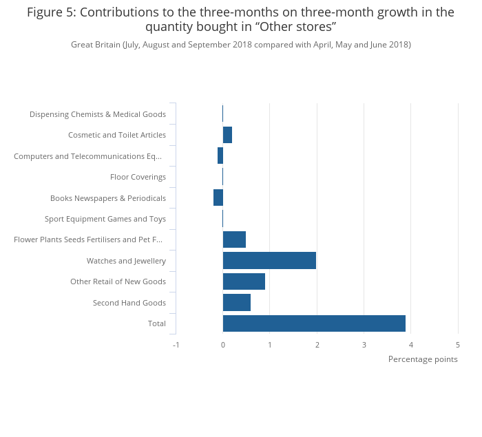 The increase of 3.9% for the quantity of goods bought in “other stores” for the three months to September 2018 was the largest overall contributor to the growth in total retail sales, due largely to strong growth in watches and jewellery stores.