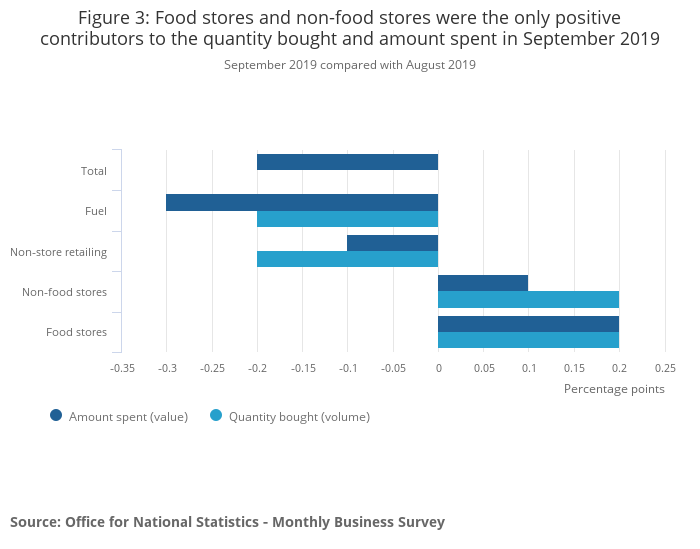 Fuel was the largest negative contributor to the amount spent at negative 0.3 percentage points, and for the quantity bought, fuel and non-store retailing both contributed negative 0.2 percentage points in September 2019.