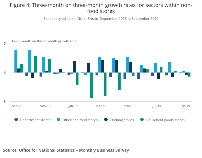 In contrast, non-food stores showed a fall in the three months to September 2019 with all sectors except “other stores” reporting falls within this sector as consumers appeared to buy fewer non-essential items in September 2019.