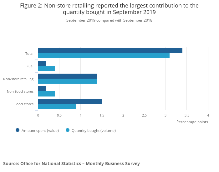 Non-store retailing provided the largest contribution to the growth in the quantity bought at 1.4 percentage points. Food stores reported the largest contribution to the amount spent at 1.5 percentage points in September 2019.