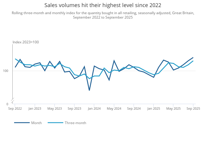 Image .csv .xlsSales volumes rose over Quarter 3 (July to Sept) 2025, with good weather in July and August 2025 helping sales of clothing. Non-store retail also had a good quarter, as mail order retailers experienced their eighth consecutive monthly rise. This was partly offset by poor sales volumes of automotive fuel across the quarter.