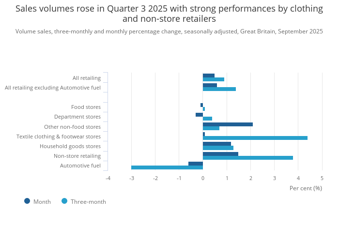 Download this chart Sales volumes rose in Quarter 3 2025 with strong performances by clothing and non-store retailers