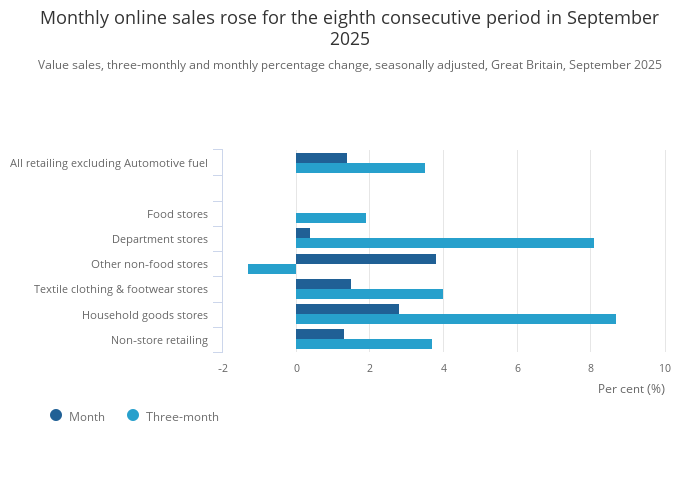 Total sales volumes rose over the month to September 2025, marking the fourth consecutive monthly rise and bringing volumes to their highest level since July 2022. Non-food stores (the total of department, clothing, household, and other non-food stores) rose by 0.9%. Among other non-food stores, computer and telecommunications retailers grew strongly.